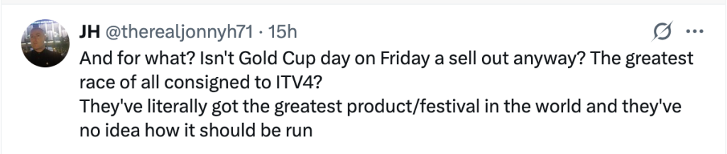 When will they realise that the cost of attending the Cheltenham Festival is the major issue behind the drop in attendance, rather than the days it is held on?